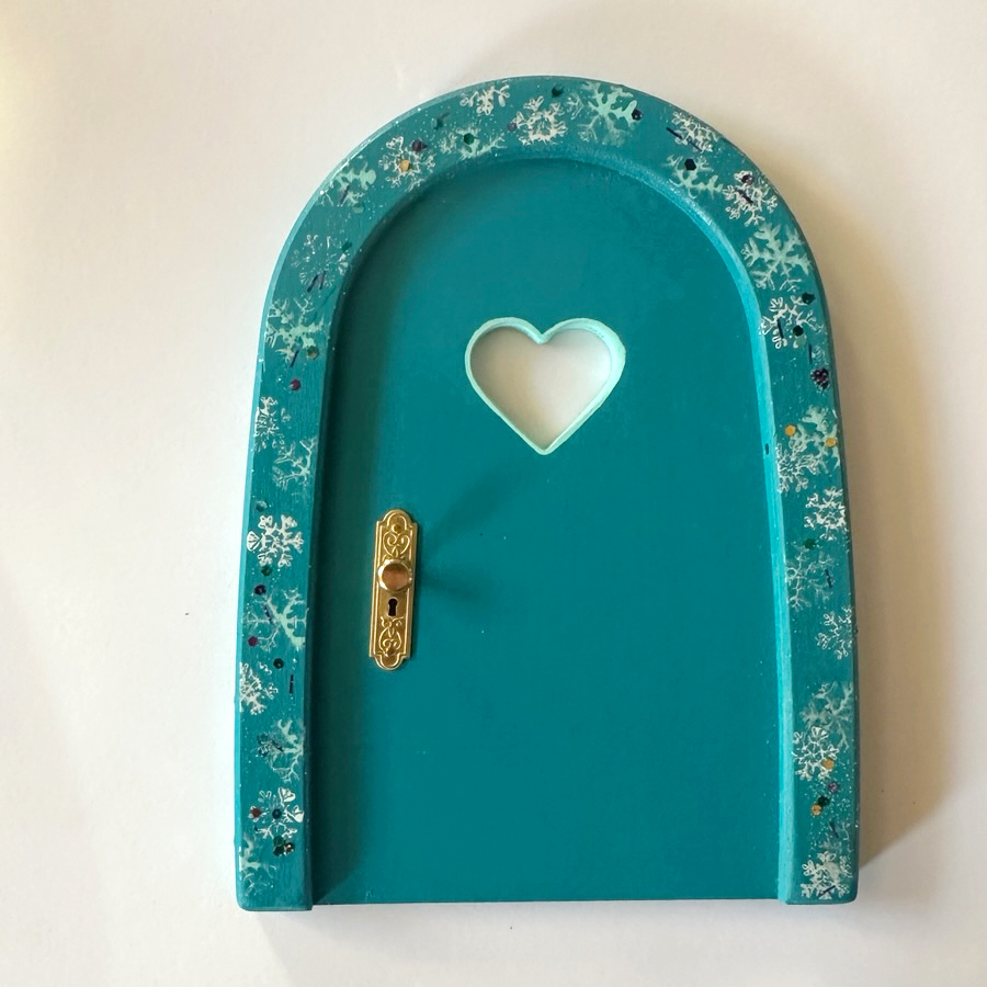 Farbe: Wichteltür, Runddach, türkis, Schneeflockenmuster Rand mit Glitzer